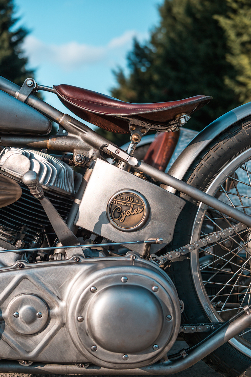 As this is a sidecar rather than a basic motorcycle, the frame is derived from a 1914 Model F Harley-Davidson, while the buggy was made in aluminum from Abnormal sketches.