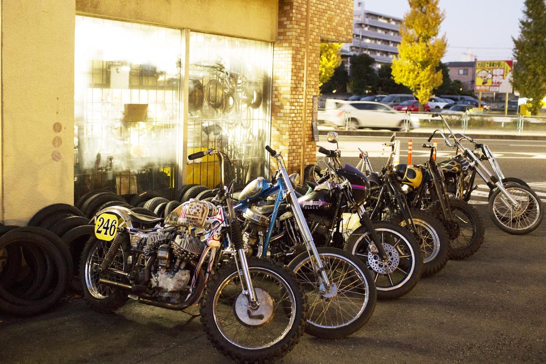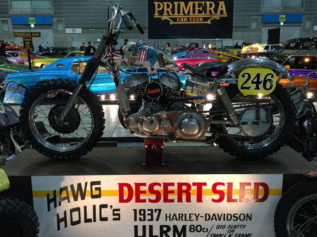 The bike stood out at 2015 Mooneyes Yokohama show – mostly because of its simple sense of fun and purposefulness. “The Desert Sled style is more popular in Triumphs, of course,” he tells me, “but this is based on a 1937 Flathead engine with a small K style frame.”
