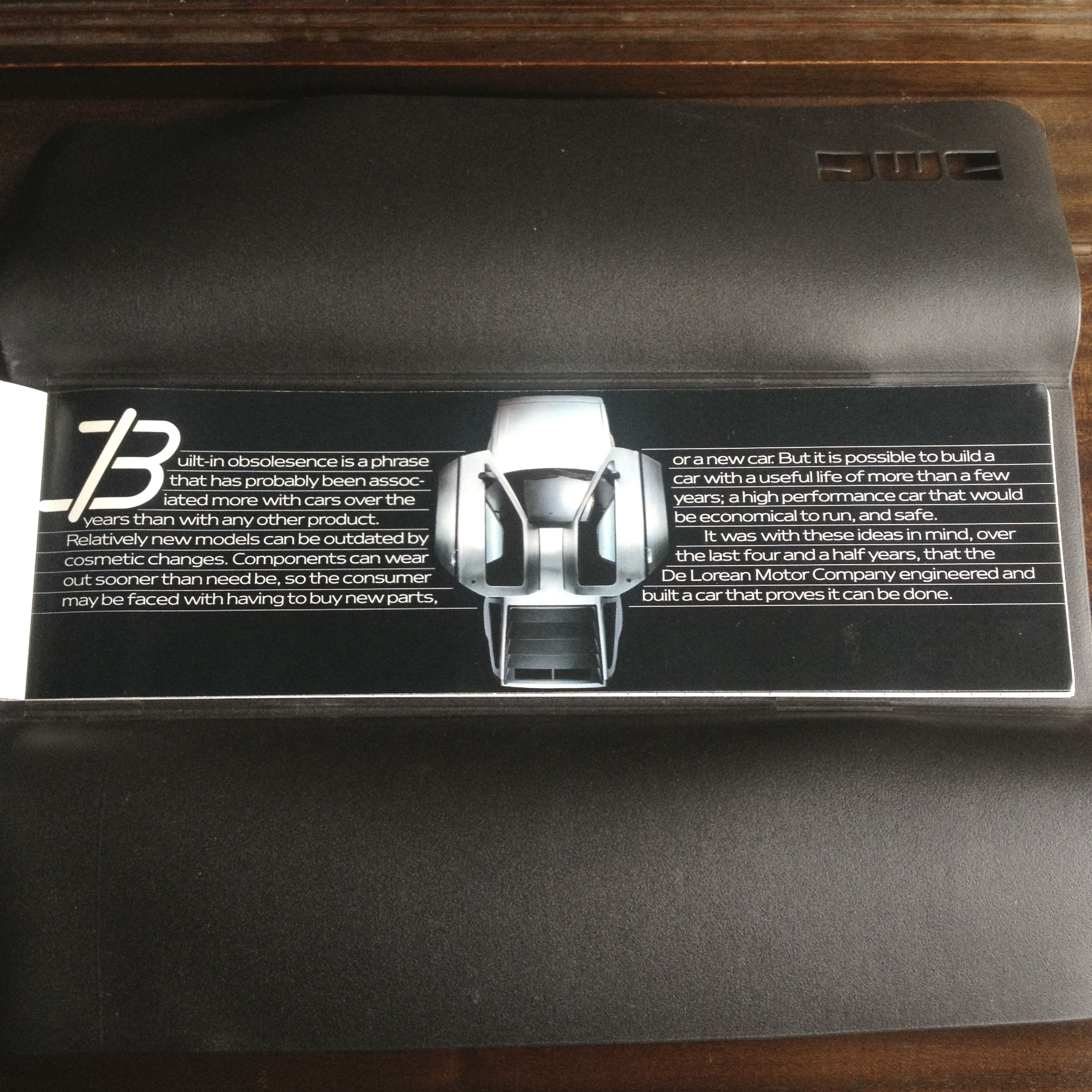 My good friend and graphiste genius Mickey Boy G palmed me this superb piece of historic 1980’s car culture a couple of weeks back. Yes, it’s an original, vinyl-bound sales brochure for the DeLorean DMC-12. The audacity of Mr DeLorean’s vision is encoded beautifully in this piece of print – and the car’s totemic status reflected in the unusually evocative way it is represented.