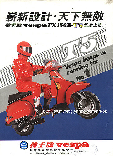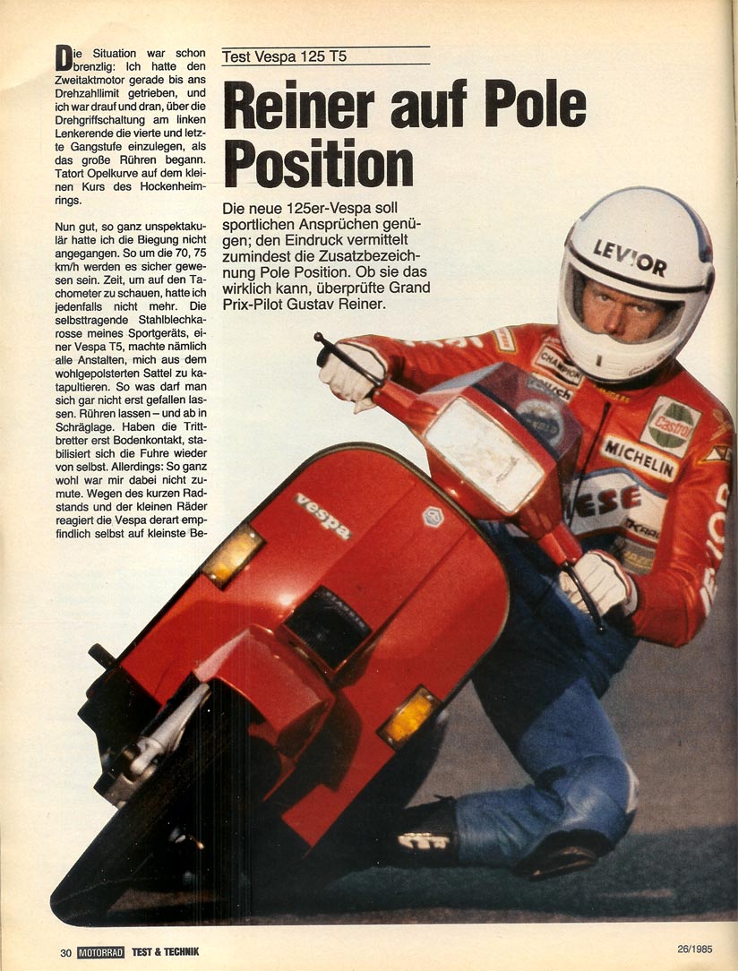Vespa 125s usually featured a cast iron, 3-port barrel, but the all-new T5 had an aluminium barrel with Nikasil lining, five transfer ports (hence the T5 name), an exhaust designed for performance (rather than simply emitting waste gas), a larger carburettor and a gearbox calculated specifically for such a scooter. The new Vespa also featured a ‘pole position’ sticker and was marketed as such, with some literature also including Formula 1 cars.