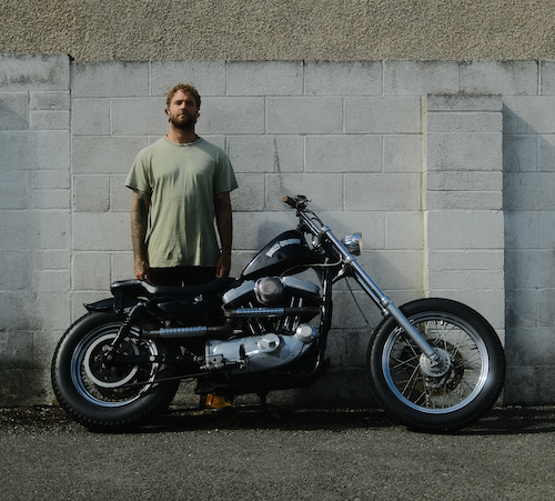 “It’s a Harley Davidson 2002 Sportster, and it’s just a ratty chopper kind of thing going on,“ he describes fondly, “It’s a Softail. It’s been stripped down to the bare minimum and I’ve made it super skinny, lightweight, and it just goes like stink. It’s got a racing cam on the bottom, and for an 883 it’s pretty pokey at high ends.”